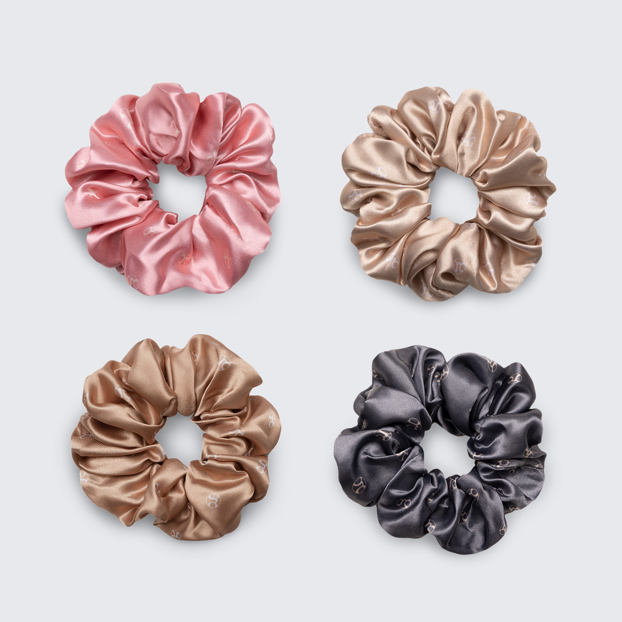 This assorted pack of 4 contains 1 charcoal, 1 pink, 1 rich cream, and 1 golden satin scrunchie.